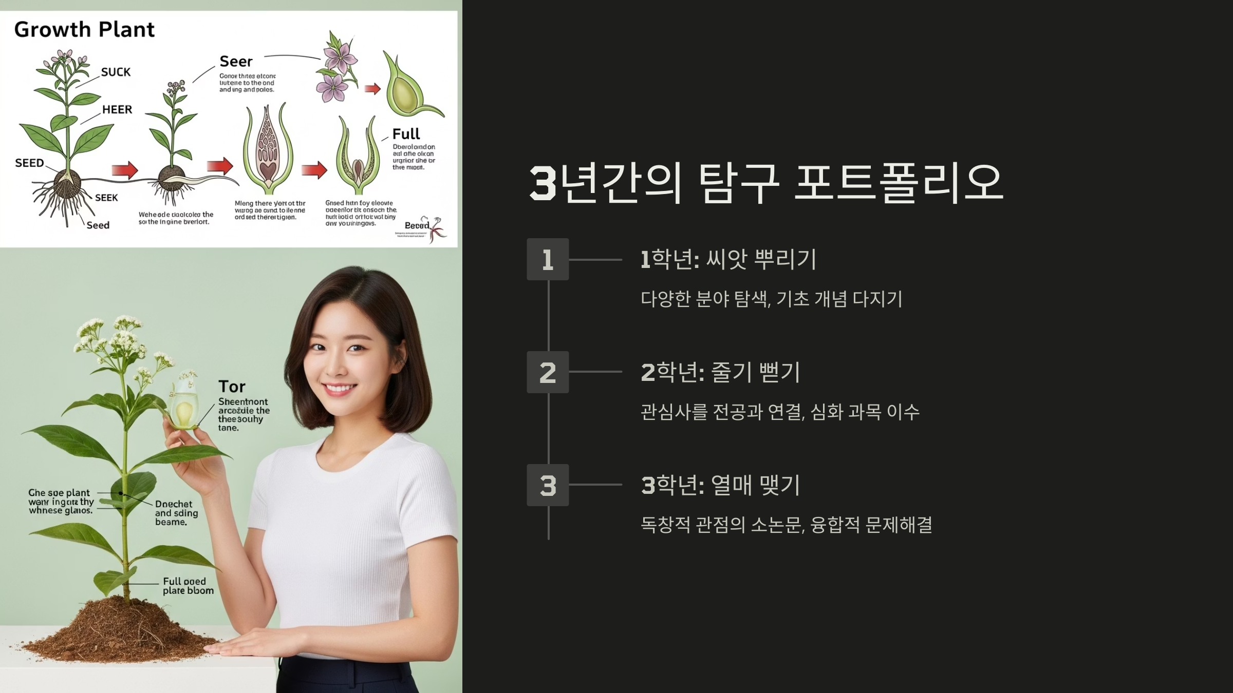 - 1단계 (1학년): 관심 분야의 씨앗 뿌리기 - 다양한 과학 분야에 대한 폭넓은 독서와 교내 활동 참여를 통해 자신의 핵심 관심 분야를 탐색하고, 관련 기초 개념을 다지는 탐구 활동을 진행합니다.