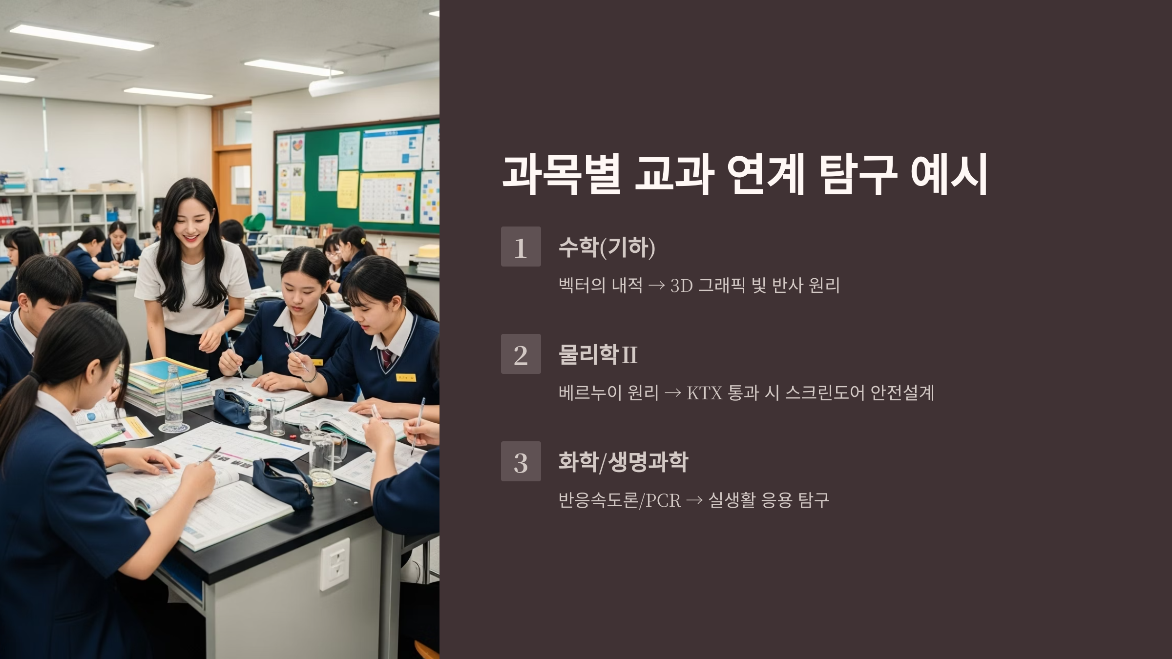 아래 표는 주요 과목의 핵심 개념을 어떻게 심화탐구로 연결할 수 있는지 보여주는 설계 예시입니다. 이 프레임워크를 활용하면, 상대적으로 낮은 카이스트 수시 등급을 보완하고 자신만의 탐구 역량을 효과적으로 드러낼 수 있습니다.